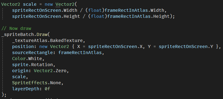 As I switched from the overload of .Draw() allowed me to specify an exact target on-screen rectangle (as it didn’t allow for rotation) to the overload of .Draw() which only accepts position and scale, I thought that it can be simply fixed by trivial algebra: